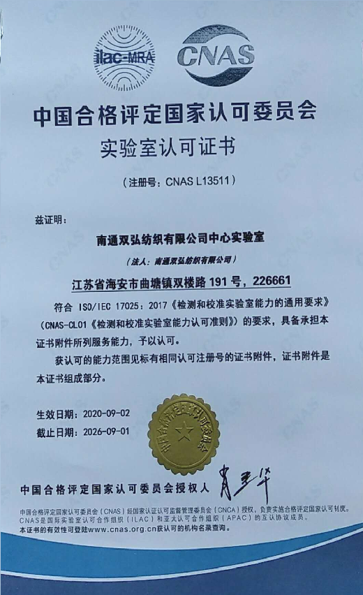 CNAS 인증이 도입 된 이후 Double Great Company의 중앙 실험실 다양한 관리 요소, 체계적인 내부 감사 및 관리 검토를 지속적으로 개선했습니다. 2 년 이상의 운영 후, 관리 성숙도는 지속적으로 개선되었습니다. ~ 안에 칠월 2020 , CNAS 인증 전문가들은 Double Great Company의 중앙 실험실에 대한 현장 감사를 수행했습니다. 전문가 그룹은 실험실의 효율적인 관리 기능, 완전한 수동 문서 및 표준화 된 운영 및 테스트를 완전히 확인했습니다. ~ 안에 구월 2020 , Double Great Company의 중앙 연구소는 전문가 검토를 성공적으로 통과하고 얻었습니다. CNA 자격증. 이는 Double Great Company의 섬유 및 원사 제품 테스트 기능이 주에 의해 인식되었으며 테스트 데이터가 더 권위있는임을 나타냅니다.