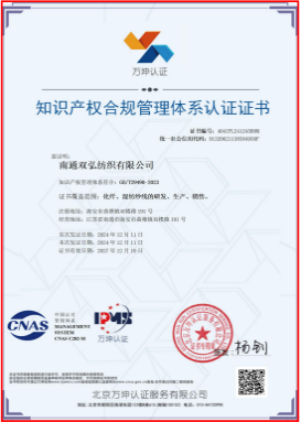 지적 부동산 준수 관리 시스템 인증은 타사 인증 기관이 기업의 내부 지적 재산 관리 시스템을 평가하여 관련 국가 표준 또는 기술 사양의 요구 사항을 준수하는지 확인하는 적합성 평가 활동입니다. 현재 Double Great Company에는 5 개의 국내 등록 상표와 2 개의 마드리드 국제 등록 상표가 있습니다. 이중 위대한 상표는 중국에서 잘 알려진 상표입니다. 50 개가 넘는 전국 발명 특허 및 유틸리티 모델 특허를 보유하고 있으며 China Textile Industry Patent Gold Award를 수상했습니다. 그것은 4 개의 국가 토치와 5 개의 스파크 계획 프로젝트를 수행했다. 그것은 3 개의 국가 표준, 11 개의 산업 표준, 4 개의 그룹 표준 및 3 개의 세관 처리 무역 단위 소비 표준을 공식화했습니다. 업계 대학-연구 결과를 수행했으며 5 개의 주요 기술과 과학 및 기술 성취도 프로젝트가 중국 섬유 산업 과학 및 기술 진보의 2 위를 차지했습니다.