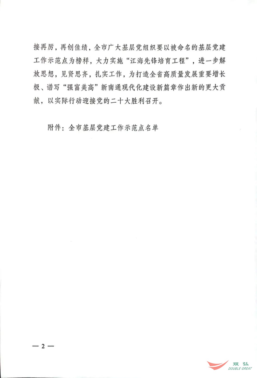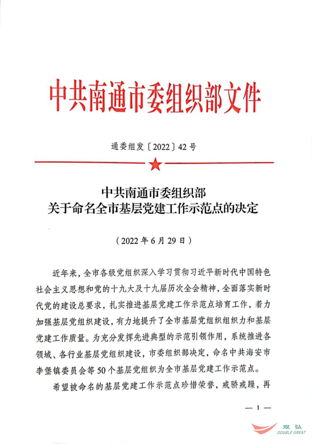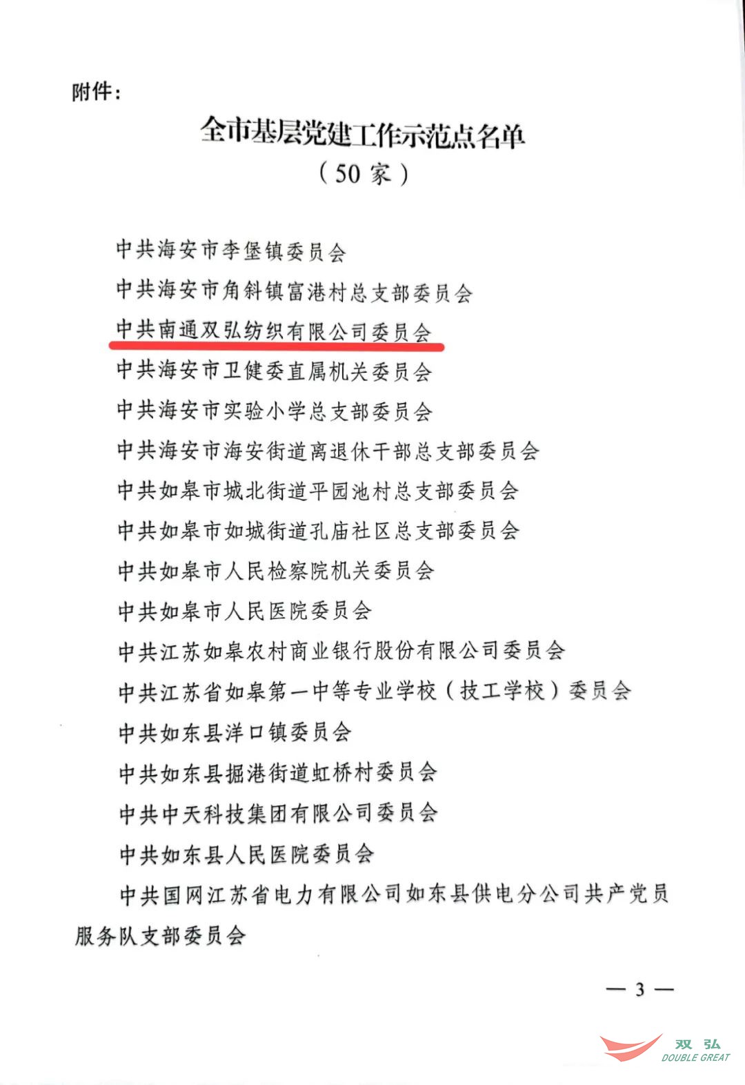 최근 CPC Nantong Municipal Committee의 조직 부서는 50 개의 풀뿌리 당 단체를 도시의 풀뿌리 파티 구축 시연장으로 명명 한 문서를 발표했습니다. Nantong Double Great Textile Co.,,, Ltd.의 파티위원회는 "도시의 풀뿌리 파티 빌딩 시연장"이라는 제목을 받았습니다.