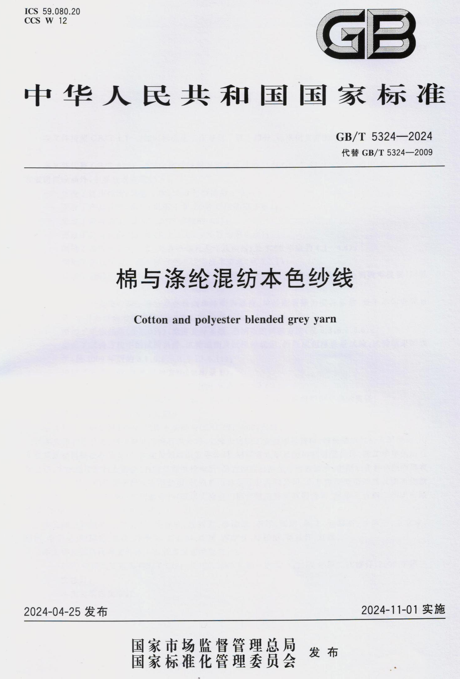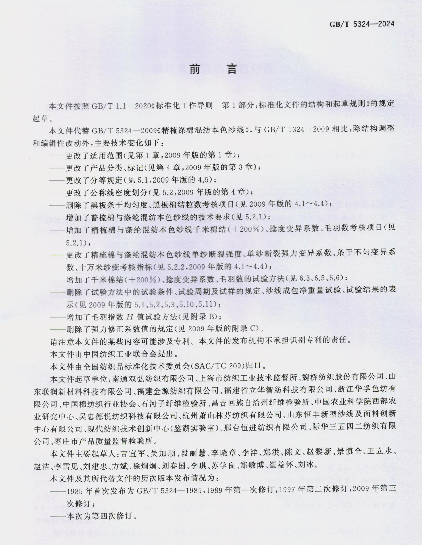 국가 표준 GB/T 5324-2024 "면 및 폴리 에스테르 혼합 천연 원사" 이중 위대한 회사가 작성했습니다 2024 년 11 월 1 일에 공식적으로 시행됩니다.