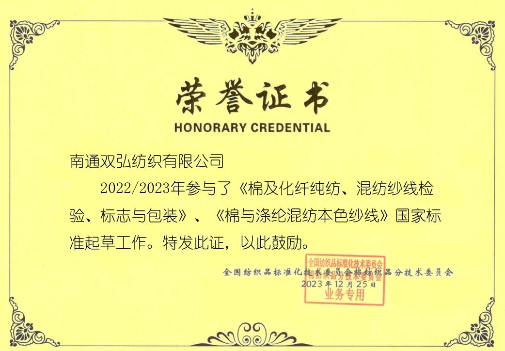 면직물 표준화를위한 국가 기술위원회의 부회장 및 중국 국립 섬유 및 의류 협의회 표준화 기술위원회 회원 단위, Double Great Company 표준화 활동에 적극적으로 참여하고 의식 및 개정에 참여합니다. 다양한 표준은 이니셔티브를 취합니다 표준의 초안 및 검토를 수행하고 많은 귀중한 의견을 제시합니다. 몇 가지 혁신적인 제안이 채택되고 고형화되어 표준 제도의 마스터 버전이되었습니다. Double Great Company는 연속적으로 있습니다 3 개의 국가 표준, 11 개의 산업 표준, 4 개의 그룹 표준 및 3 세관 처리 무역 단위 소비 표준, 섬유 산업 표준 및 섬유 표준화에 대한 뛰어난 기여를 가진 국가 기업.