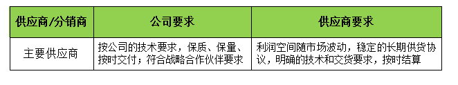 이 회사는 주요 공급 업체와 전략적 파트너십을 구축했으며 3 개 규칙에 따라 공급 업체를 분류하고 관리합니다.