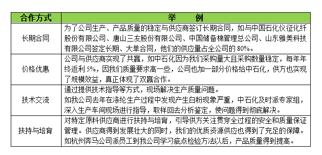 이 회사는 공급 업체와의 관계에 특별한 관심을 기울이고 주요 공급 업체 및 파트너를 확인했습니다. 두 당사자 간의 장기 협력, 상호 개선 및 상생 개발을 장려하기 위해 주로 다음 측면을 수행합니다.