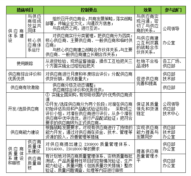 공급 업체의 자체 개선 및 공급 업체의 지속적인 개선을 촉진하기 위해 공급 업체의 평가 및 인센티브 조치를 사용합니다. 공급 업체 개발 및 건설을 통해 고품질 공급 업체 자원을 소개하고, 기존 공급 업체의 생산 규모 및 관리 수준을 개선하며, 조달 비용을 줄이며, 공급망의 경쟁력을 향상시킵니다.